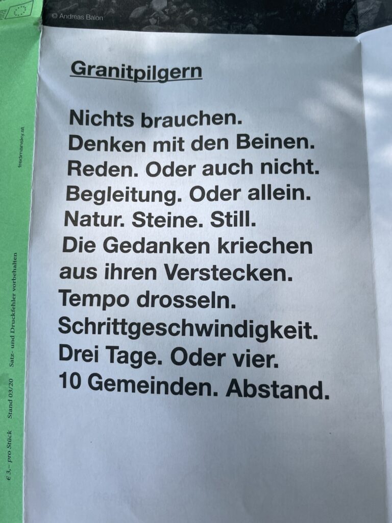Im Mühlviertel – im sanften Hügelland nördlich der Donau – spielt Granit eine prägende Rolle: In Mauern, in Steinblöcken, in markanten Felsformationen. Das „Granitpilgern“ verbindet diesen Landschaftscharakter mit Pilgerpraxis. Man wandert über Pfade, an alten Steinmauern entlang, durch lichte Wälder und über hügelige Felder. Die Ruhe des Granitlands spiegelt sich in der Stimmung wider: fest, klar, geerdet.