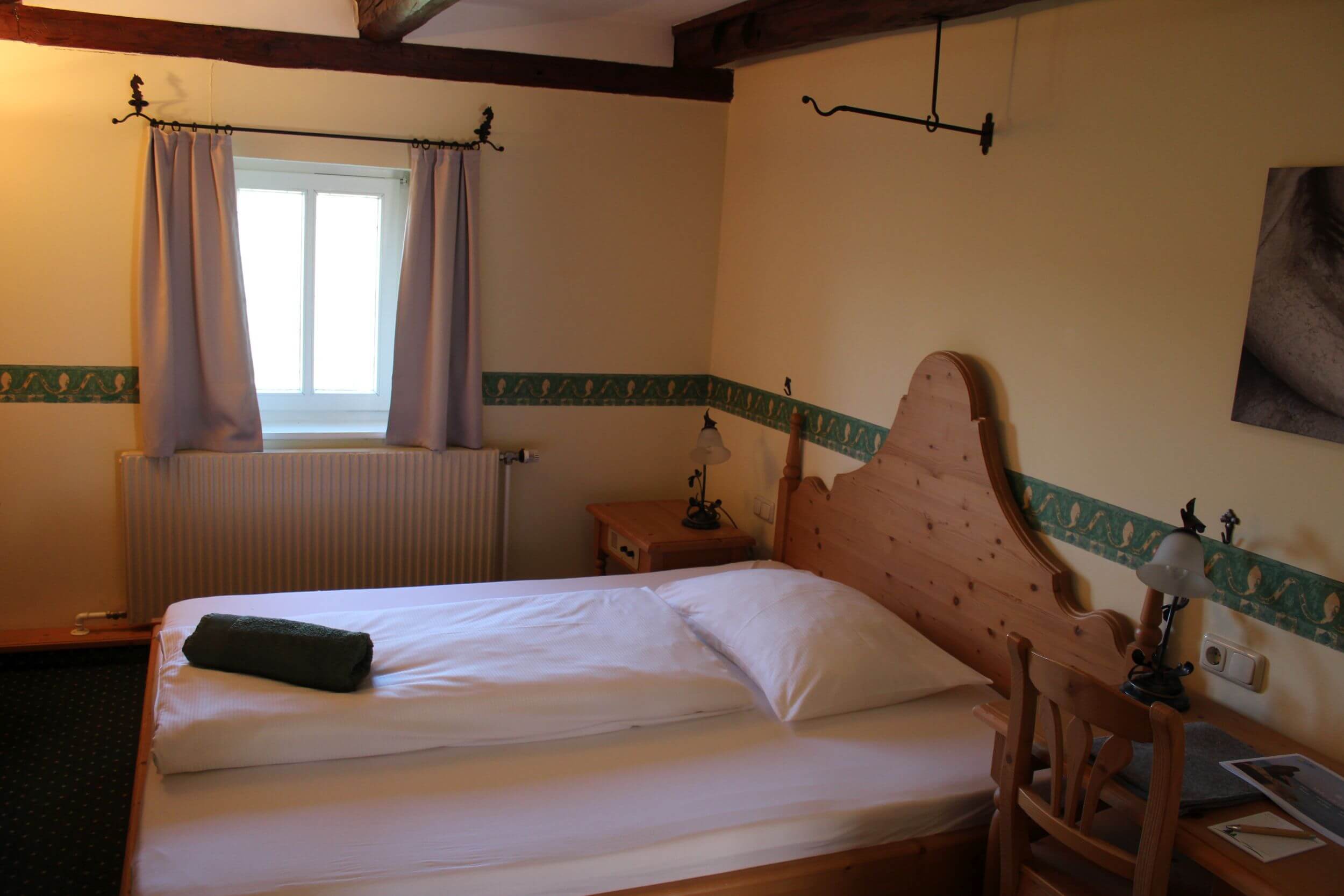 Die Landblickzimmer im ländlichen Stil haben Doppelbett und entweder Teppich- oder Holzboden. Die Bäder sind mit Badewanne, WC, Fön ausgestattet.